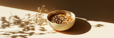 A rich protein bowl with peanut butter and chocolate shavings, surrounded by soft beige tones and delicate flower shadows, evoking a healthy and balanced breakfast with an organic feel, banner