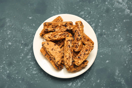 Freshly baked almond biscotti cookies pattern on blue background. Sweet food concept.