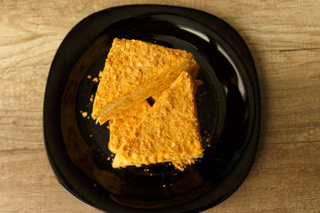 Slice of orange cake on black plate on the wooden table, food background. Napoleon