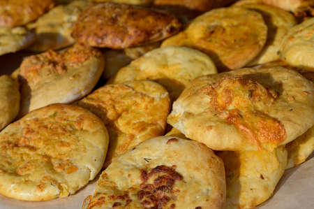 Hungarian street food - langos. Flatbread with sour cream-garlic sauce and cheese