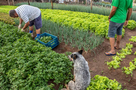Marilia, Sao Paulo, Brazil, September 04, 2019. Family farmer picks spinach leaves in a vegetable garden made up of different types of vegeta bles with chives and lettuce in the background
