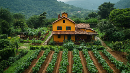 An idyllic rural farmhouse with a vibrant vegetable garden, showing sustainable living and organic farming.