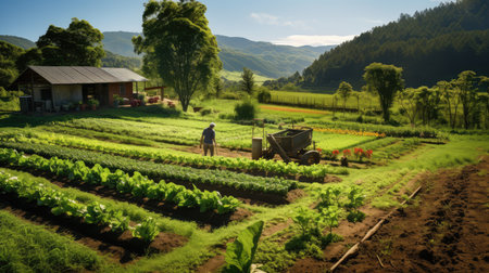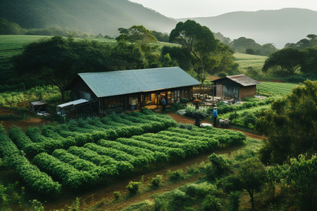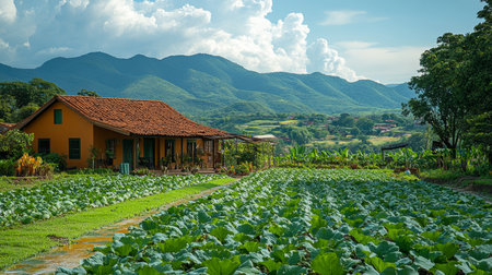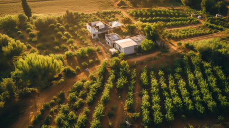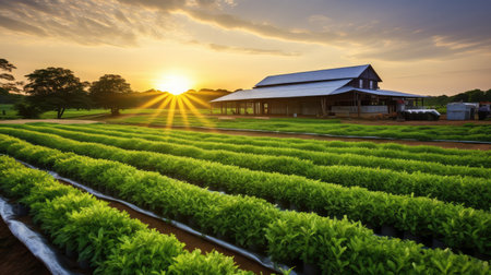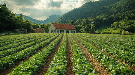 Captivating view of a vibrant farmhouse surrounded by lush crops, showcasing rural agricultural beauty and harmony with nature in a tranquil landscape.