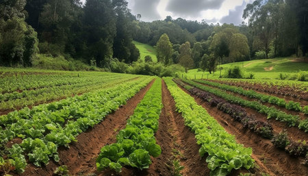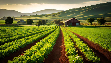 A picturesque farm scene with neat rows of vibrant green vegetables stretching across a hillside. The lush greenery contrasts beautifully with the rich brown soil.