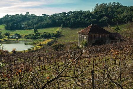 Rural landscape with old farmhouse amidst vineyards surrounded by wooded hills near Bento Goncalves. A friendly country town in southern Brazil famous for its wine production.