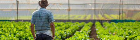 Farmer overseeing lettuce fields under high-tech mesh, symbolizing modern sustainable agricultural practices.