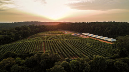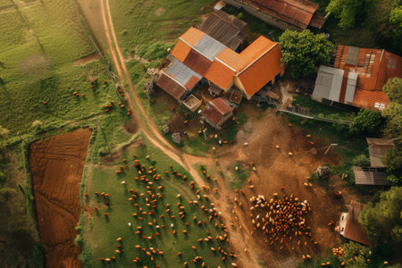 The golden light of sunset bathes a modern dairy farm in a warm glow. From an aerial perspective, cows graze peacefully in lush green pastures, highlighting a scene of sustainable agriculture and the tranquil rhythm of rural life.