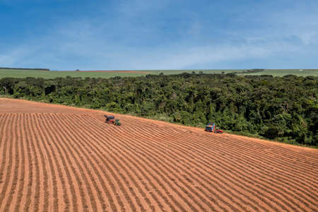 Above view captures agricultural machinery in fields, demonstrating planting techniques through aerial footage