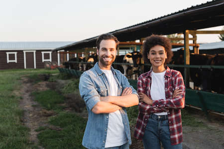 happy multiethnic farmers standing with crossed arms near blurred cowhouse