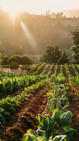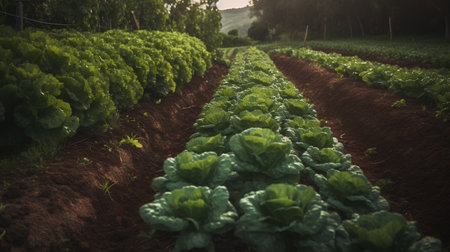 sunlit rows of fresh vegetables in an organic farm, created with generative ai