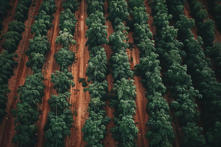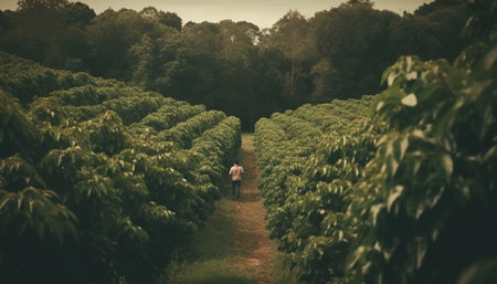 Scenic Coffee Plantation with Rows of Plants and Mountains in Background. Concept Travel Photography, Coffee Plantation, Mountain Landscape, Nature Scenery, Agricultural Field