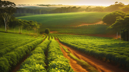 Rows of vibrant greens stretch across the field, illuminated by the early morning sun in a farming region.