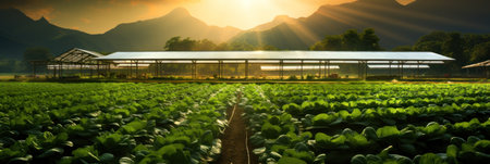 A panoramic view of a lush green farm with rows of crops stretching into the distance, showcasing the vastness and productivity of modern agriculture. Generative Ai