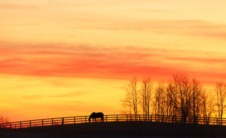 Rural landscape. Grazing horses silhouette. Positive energy and Spirituality. Feeling of tranquility. Farms area. Autumn colors. Dramatic and sad evening. Southern Brazil.