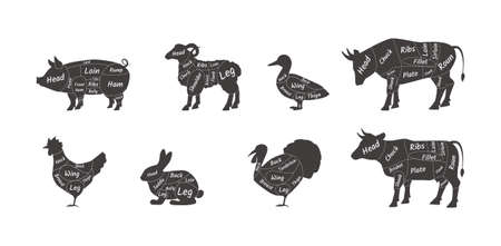 Butcher diagram animal part scheme set. Mutton, lamb, pork, duck, chicken, turkey, cow, rabbit, bull meat cuts. Marked body piece for cooking at restaurant, grocery store, market retail flat vector