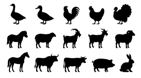 Vector farm animals silhouettes of bull, cow, turkey, rabbit, pig, rabbit, goose, duck, rooster, chicken, horse, sheep, goat, chicken.
