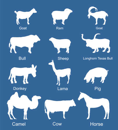 Ranch farm animals collection vector silhouette illustration isolated on background. Bull, cow, donkey, sheep, horse, pig, goat, ram, camel, lama Domestic cattle shape symbol. Cloven hoof animals.