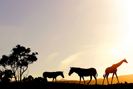 Silhouettes of animals at sunset on horizon