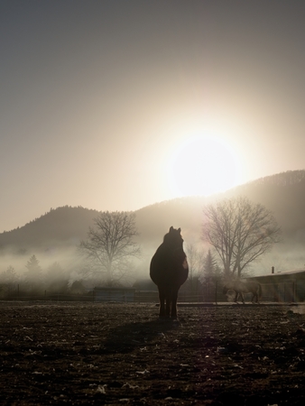 Horse ranch. Fantastic foggy valley with muddy ground and sunny beams. Dramatic colorful scenery.