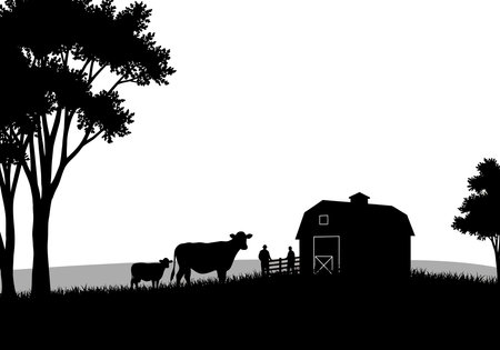 Farm scene silhouette. This image shows a farm scene with cows, a barn, trees, and a fence, depicting rural agriculture and peaceful countryside life. Vector clipart illustration design.