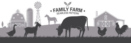 Family farm horizontal seamless pattern. Vector illustration. Vintage rustic design with chicken, goat, goose, horse, cow on the grass and farm house silhouette for background, wallpaper.