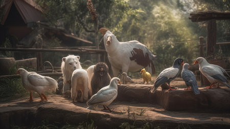 Various farm animals are gathered together on a farm, isolated, created with Generative AI