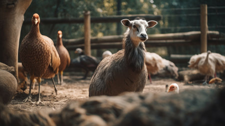 Sunlit farm landscape with free range poultry and livestock abundance generated by artificial intelligence