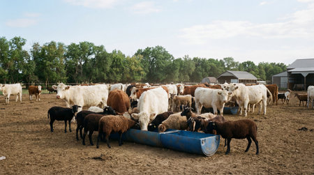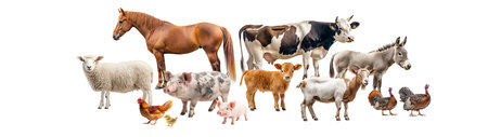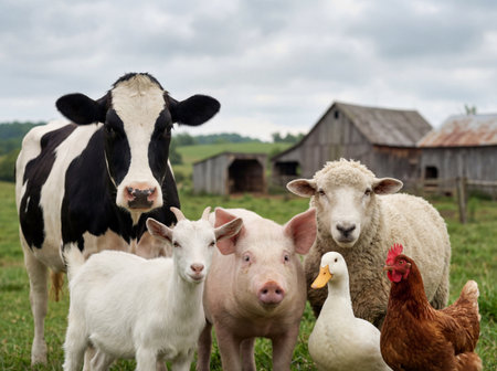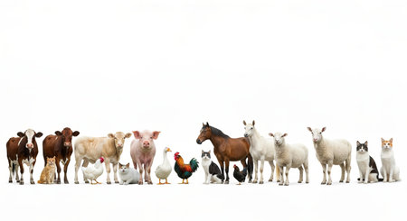 Various domestic farm animals standing together calmly, PNG, created with Generative AI