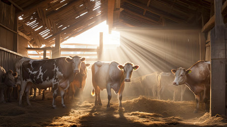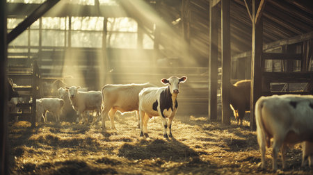 This tranquil farm showcases premium cows and goats under soft lighting, surrounded by elegant natural textures, highlighting rural life at dawn.