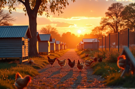 Chickens roaming in farmyard at sunrise with warm sunlight and farm buildings. That the image is generated using AI.