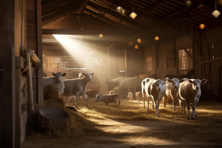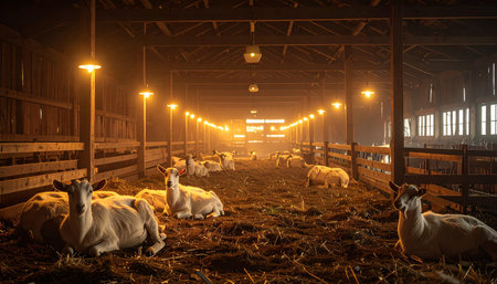 Under the gentle glow of overhead lamps, a herd of young goats rests peacefully for the night. The warm light illuminates the rustic wooden barn, casting long shadows and creating a serene, cozy atmosphere of quiet contentment on the farm.