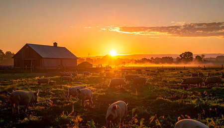 Morning sunlight casting a warm glow on a well-maintained pigsty, where pigs roam freely in a spacious enclosure. Generative AI