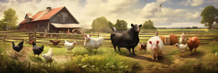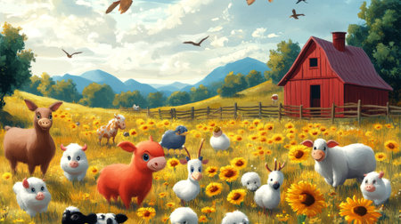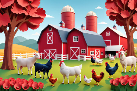 Colorful Farmyard Scene Featuring Various Domestic Animals Near Red Barns in Bright Daylight