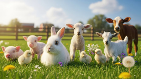 A black and white cow, white goat, pink pig, sheep, chicken and duck pose together in a lush green field with rustic wooden barns under a blue sky on a sunny summer day.