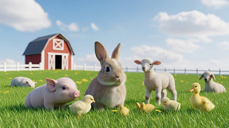 Rabbit, ducklings and a red barn on a green meadow