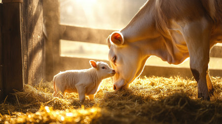 A mother cow gently licking her newborn calf in a barn, surrounded by golden hay and warm sunlight filtering through wooden slats.