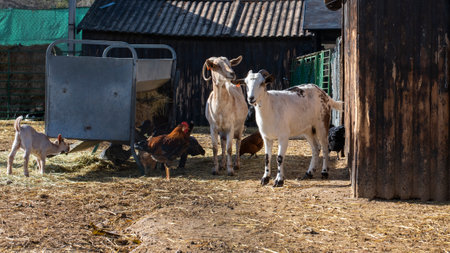 Goats on the farm eat hay. Farming. High quality photo