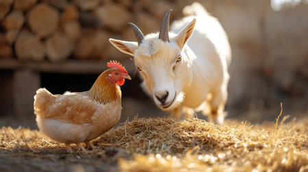 goat and chicken sharing feeding area on farm