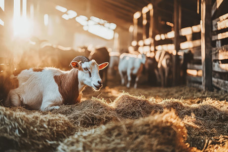 A cozy barn interior with goats lying on fresh hay, sunlight streaming through the wooden slats.