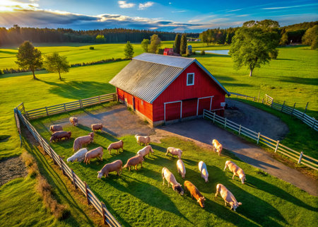 The golden light of sunset bathes a modern dairy farm in a warm glow. From an aerial perspective, cows graze peacefully in lush green pastures, highlighting a scene of sustainable agriculture and the tranquil rhythm of rural life.