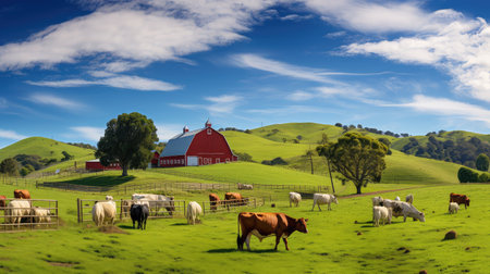 organic farm, with crops growing in fields and livestock grazing nearby, created with generative ai