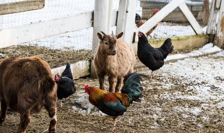 Cute dwarf goat surrounded by chickens looking at the camera. Beautiful farm animals at petting zoo.