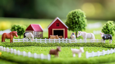 A detailed display of various farm animals gathered around a rustic wooden barn. Generate AI