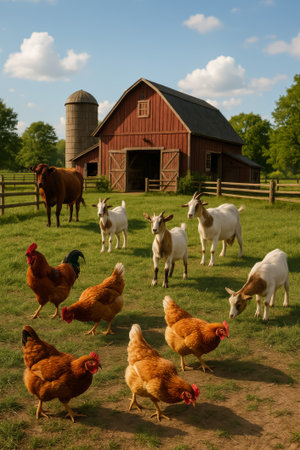 A picturesque farm scene featuring chickens, goats, and a cow in front of a barn