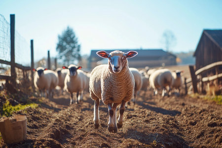 A flock of sheep grazes leisurely as one sheep leads the way along a dirt path. The sun casts a warm glow over the pastoral landscape, highlighting the tranquil beauty of the countryside.
