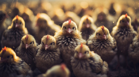 a lot of chickens waiting to be fed up, they are looking at the viewer. Neural network generated in May 2023. Not based on any actual scene or pattern.