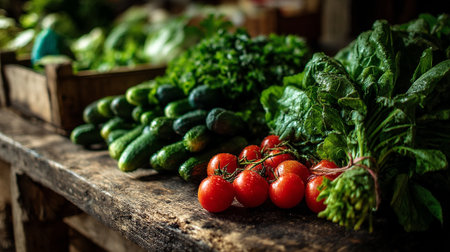 Fresh Produce Display: Vibrant Tomatoes, Cucumbers, and Greens on Rustic Wood