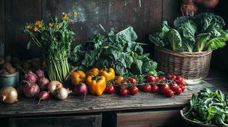 A colorful display of fresh vegetables spreads across a rustic wooden surface, featuring kale, tomatoes, and diverse leafy greens. This vibrant arrangement showcases natural produce.