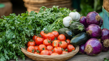 Vibrant assortment of fresh vegetables and herbs sourced from the market, perfect for nutritious meals.