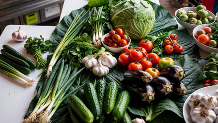 A rich harvest of various vibrant vegetables spread across large leafy greens. AI generated image